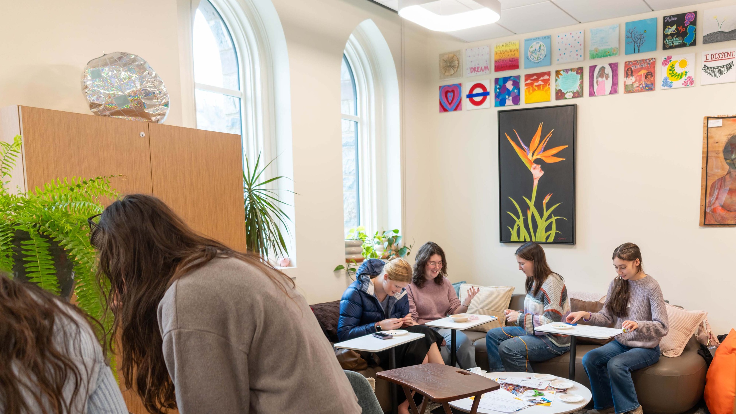Volunteers gather in the Gender, Leadership, and Empowerment Center Lounge to create bracelets as messages of strength to new parents, through the St. Luke's Nurse Family Partnership initiative. Photo by Christa Neu.
