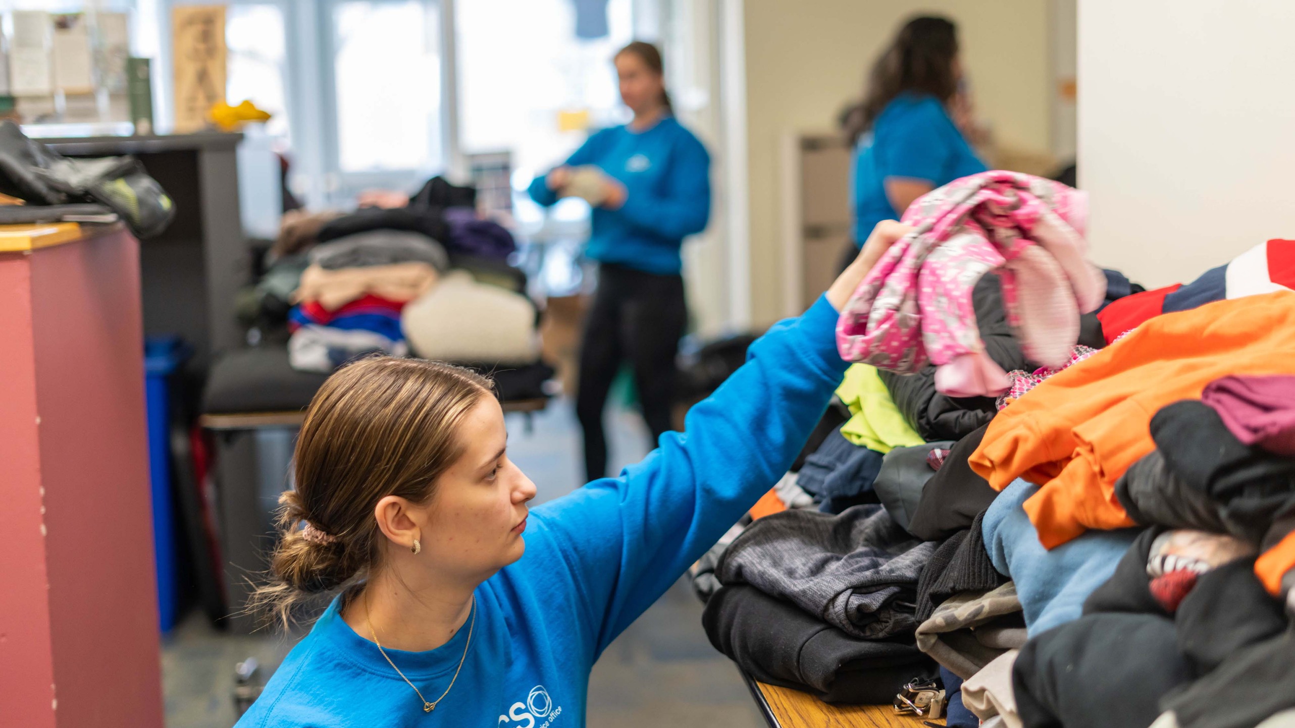 Volunteers help organize clothing donations at the Broughal Middle School Family Center.