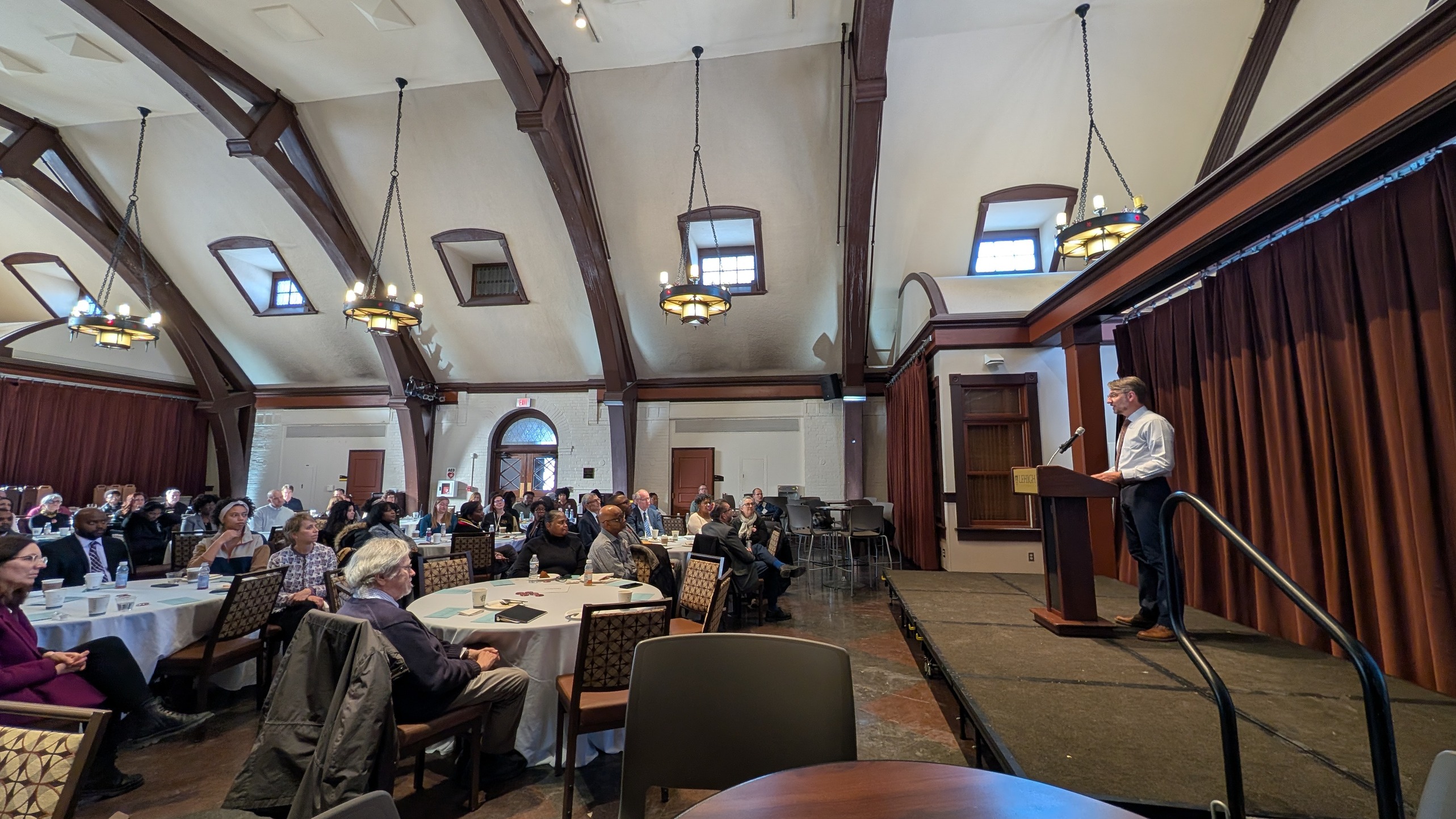 MLK Celebration Committee co-chair addresses attendees at the committee's annual breakfast event, held on 1/23/26 at Lamberton Hall.